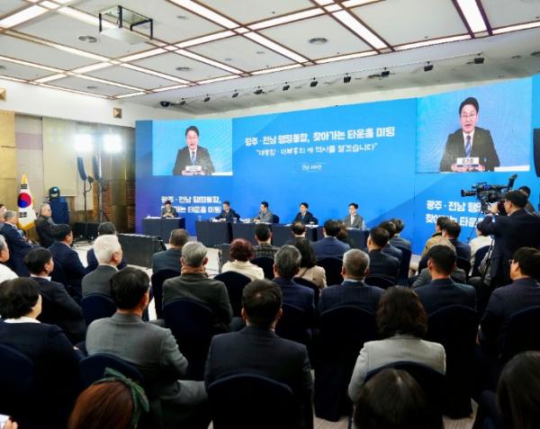 광주시와 전남도가 광주전남 행정통합에 대한 궁금증과 우려를 해소하기 위해 권역별로 시·도민과 직접 소통하는 ‘찾아가는 타운홀미팅’을 마련, 통합 방향과 과제에 대해 공개 토론을 진행했다.광주광역시(시장 강기정)와 전라남도(지사 김영록)는 4일 오후 해남문화예술회관 다목적실에서 서남권 시·도민 120여명이 참석한 가운데 ‘...