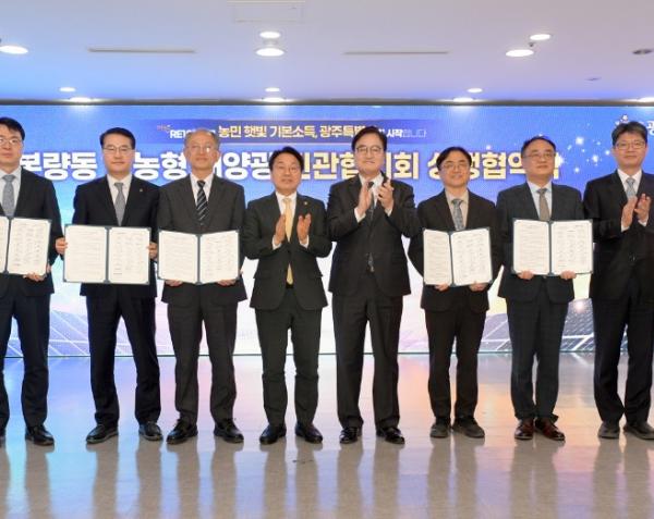 광주시가 이재명 정부 국정과제인 ‘농민 햇빛연금 기본소득’ 실현을 위해 본량동 영농형 태양광 상생모델 구축에 본격 나선다.광주광역시(시장 강기정)는 11일 오후 시청 중회의실에서 ‘본량동 영농형 태양광 민관협의회 상생협약식’을 개최했다. 협약식에는 강기정 광주시장과 우원식 국회의장, 농민대표 등 150여명이 참석했다.‘본...