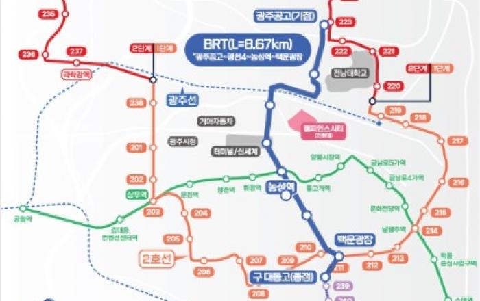 광주시가 대규모 도시개발로 교통 혼잡이 예상되는 광천권역에 도입하는 ‘백운~매곡 간선급행버스체계(BRT)’ 구축 사업을 올해 본격 추진한다.광주광역시(시장 강기정)는 총 사업비 361억원을 투입해 백운광장에서 광주공고까지 8.67㎞를 오가는 ‘백운~매곡 간선급행버스체계