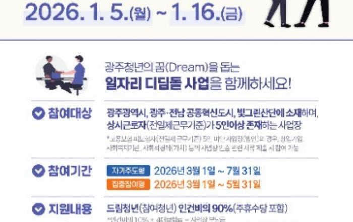 광주광역시(시장 강기정)는 올해 상반기 광주 청년들에게 직무현장 일경험을 제공할 ‘광주청년 일경험 드림터(사업장)’를 오는 16일까지 모집한다.‘광주청년 일경험 드림’ 사업은 미취업 청년이 다양한 사업장에서 일경험을 통해 직무 역량을 강화하고, 지역사회 참여를 통해 지
