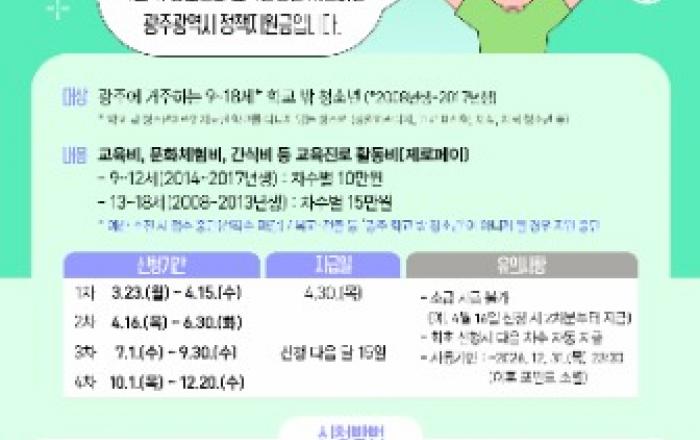 광주시가 학교라는 울타리 밖에서 새로운 미래를 설계하는 청소년들이 소외되지 않도록 촘촘한 교육안전망을 가동한다.광주광역시(시장 강기정)는 학교 밖 청소년의 교육 기회를 확대하고 안정적인 성장을 뒷받침하기 위해 ‘학교 밖 청소년 교육활동비 지원사업’을 운영키로 하고, 오