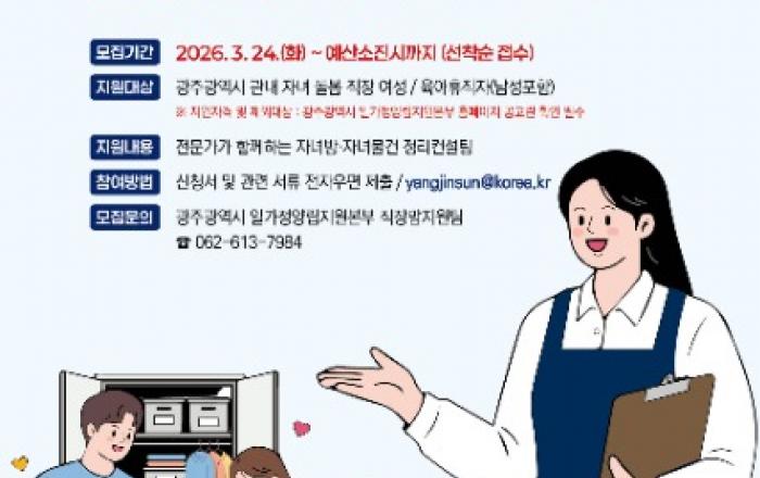 광주광역시 일가정양립지원본부는 광주지역 직장여성의 일·가정 양립을 돕기 위한 ‘찾아가는 고충해결단 정리컨설팅 서비스’에 참여할 12가구를 24일부터 선착순 모집한다.이 서비스는 직장생활과 자녀 돌봄을 병행하는 직장여성의 가정 내 정리 부담을 덜고 보다 쾌적한 생활환경을