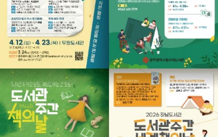 광주광역시 시립도서관(무등·사직·산수·하남)은 ‘도서관 주간’(4월 12∼18일)과 ‘세계 책의 날’(4월 23일)을 맞아 다양한 독서문화 행사를 마련, 3월 24일부터 참가 신청을 받는다.매년 4월 12일은 ‘도서관의 날’로 도서관에 대한 이해와 관심을 높이기 위해