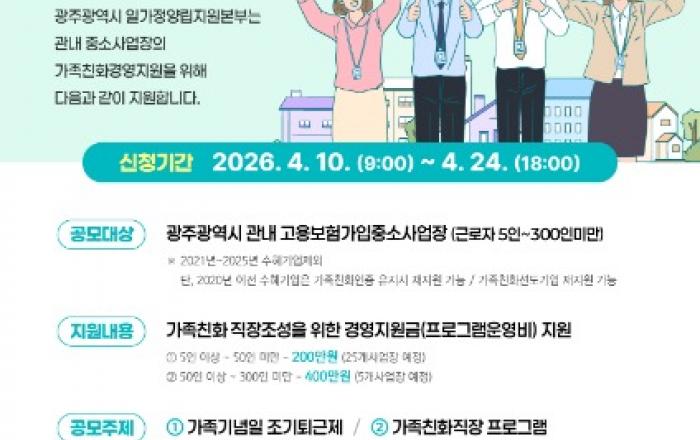 광주광역시 일가정양립지원본부는 ‘2026년 가족친화경영 지원사업’에 참여할 지역 중소사업장 30곳을 오는 10일부터 24일까지 모집한다.‘가족친화경영 지원사업’은 중소사업장의 가족친화문화 정착과 일·가정 양립 확산을 위해 광주시가 지난 2019년 전국 최초로 도입했다.