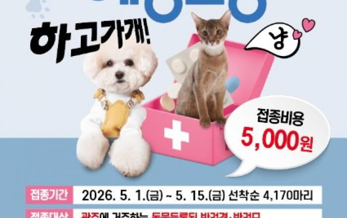 광주광역시(시장 강기정)는 반려동물과 시민의 건강을 지키기 위해 5월 1일부터 15일까지 ‘봄철 광견병 예방접종 사업’을 추진한다. 광주시는 매년 봄과 가을 두 차례 광견병 예방접종 사업을 실시하고 있다. 접종 대상은 광주시 거주 반려견·반려묘이다. 단, 임신 또는 이
