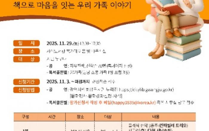 광주광역시립사직도서관은 오는 29일 오후 1시30분부터 5시30분까지 사직도서관 북카페 이음과 다목적실에서 ‘2025 사직도서관 단무지(단순·무한·지속) 독서행사’를 연다.이번 행사는 ‘책과 함께, 가족이 함께–책으로 마음을 잇는 우리 가족 이야기’를 주제로, 가족 단