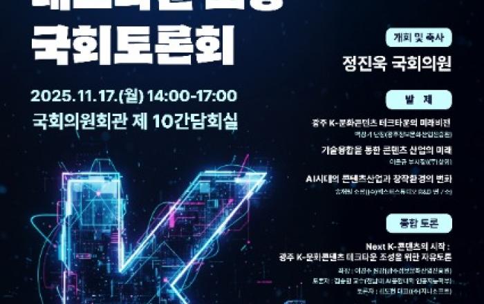 광주광역시(시장 강기정)가 오는 17일 오후 2시 국회의원회관 2층 간담회실에서 ‘K-문화콘텐츠 테크타운 조성 국회토론회’를 개최한다.이번 토론회는 정진욱 국회의원(광주 동·남 갑)이 주최하고 광주시가 주관한다. 인공지능(AI) 시대에 발맞춰 콘텐츠 산업이 나아가야 할