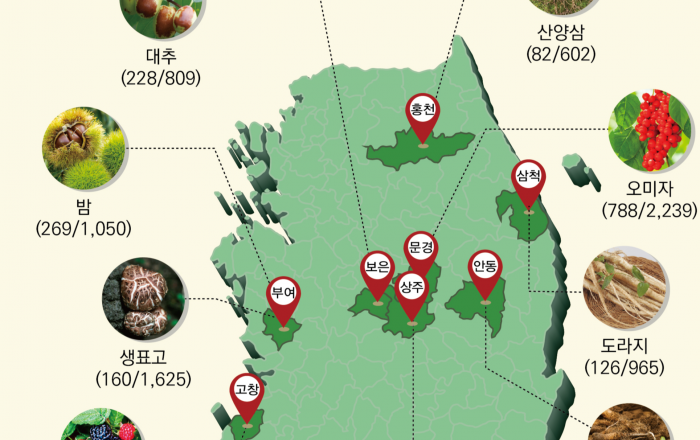 산림청은 지난해 수실, 조경재, 약용식물 등에 대한 임산물 생산조사* 결과 2022년 임산물 생산액은 전년(2021년 7조 1,982억 원)보다 5,276억 원 증가한 7조 7,258억 원으로 조사됐다고 19일 발표했다. * 1976년 국가승인통계(제
