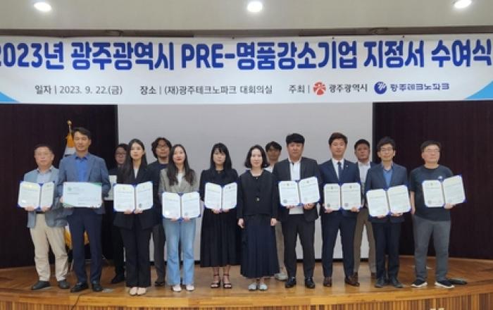 광주광역시는 지역경제를 견인할 '2023년 제7기 예비(PRE)-명품강소기업' 13곳을 선정하고 22일 광주테크노파크에서 지정서 수여식을 가졌다. 제7기 예비-명품강소기업 중 신규 기업은 ㈜세연이앤에스, ㈜씨엔에스컴퍼니, ㈜에이버츄얼, 에코피스㈜, ㈜오딧세이글로벌,
