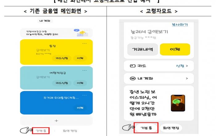 고령층 금융소비자의 모바일 뱅킹 사용이 한층 편리해 진다. 금융감독원은 국내 18개 은행이 금융소비자가 편리하게 모바일 금융앱을 사용할 수 있도록 소비자 친화적으로 화면을 구성한 ‘고령자모드’를 출시했다고 26일 밝혔다. 앞서 금융당국은 은행권과 공동으로 실무추진