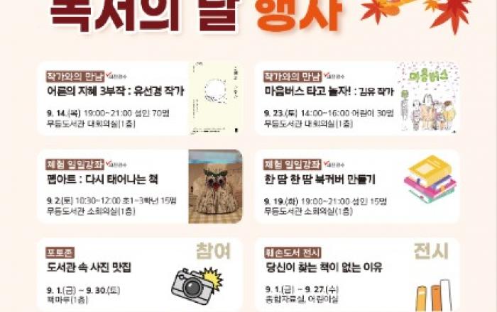 광주광역시립도서관(무등‧사직‧산수‧디지털정보)은 9월 독서의 달을 맞아 ‘펼쳐보자 책도, 꿈도’를 주제로 도서관에서 책과 더불어 즐길 수 있는 강연, 체험, 전시 등 다양한 독서문화 행사를 운영한다.무등도서관은 ▲‘어른의 어휘력’ 저자 유선경 작가 강연 ▲‘마음버스’