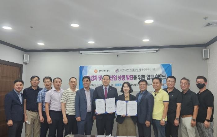 광주광역시(시장 강기정)와 한국외식업중앙회 광주광역시지회는 18일 ‘광주시 김치산업과 외식산업의 상생협력을 위한 업무협약’을 체결했다.협약식에는 주재희 광주시 경제창업국장, 김상재 ㈔한국외식업중앙회 광주광역시지회장과 5개 자치구지부 임원, ㈜해담촌, ㈜김치타운, ㈜채자