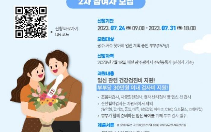 광주광역시(시장 강기정)는 첫 아이 임신을 준비하는 예비부모를 대상으로 임신 관련 건강검진비를 지원하는 ‘행복플러스 건강지원사업’ 하반기 대상자를 24일부터 31일까지 모집한다.‘아이 낳아 키우기 좋은 맘(MOM) 편한 광주 만들기’ 임신 지원정책의 하나로 시행하고 있