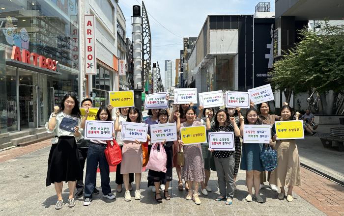 충청북도 소상공인정책과는 6월 8일(목) 성안길을 찾은 도민들을 대상으로 경기침체로 어려움에 처해있는 소상공인의 사기진작과 소비촉진 등을 위해 ‘힘내라! 소상공인’ 캠페인을 실시하였다. 지역 내수 진작을 위해서는 지역사랑상품권을 동네 가게에서 사용하는 등 사소한 것