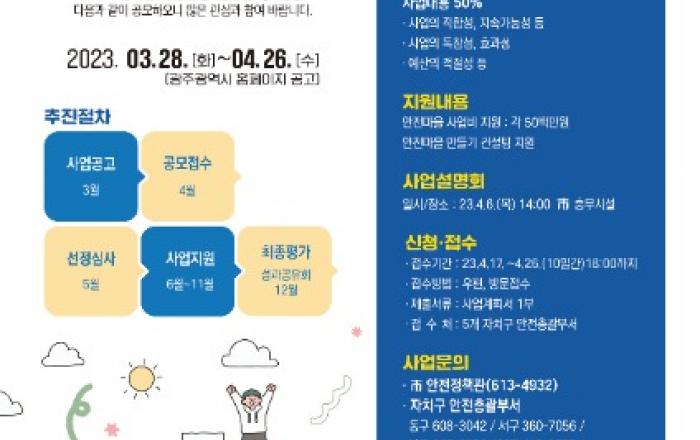 광주광역시(시장 강기정)가 ‘언제 어디서나 안전도시 광주’를 실현하기 위해 4월26일까지 ‘시민주도형 안전마을 만들기 프로젝트’를 공모한다.‘시민주도형 안전마을 만들기 프로젝트’는 민선 8기 공약사업으로 마을에서부터 안전한 공동체를 실현하는데 목표를 두고, 지역주민이