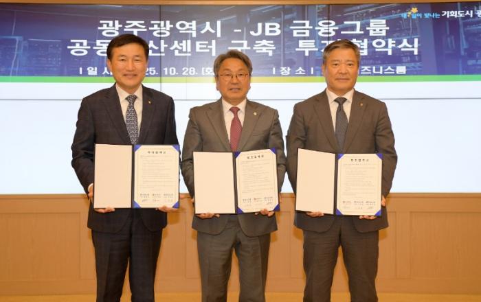 광주광역시(시장 강기정)는 28일 시청 비즈니스룸에서 광주은행, 전북은행과 ‘공동전산센터(IDC) 구축을 위한 투자협약(MOU)’을 체결했다.이번 협약은 광주경제자유구역 AI융복합지구(광주연구개발특구 첨단3지구)에 JB금융그룹 공동전산센터를 구축하고 통합 운영하기 위한