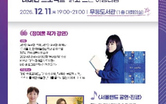 광주광역시 시립도서관은 한강 작가의 노벨문학상 수상 1주년을 기념해 북콘서트와 멋글씨(캘리그래피) 전시를 개최한다.오는 11일 오후 7시 무등도서관 대회의실에서는 ‘다시 온(ON) 문학’을 주제로 북콘서트가 열린다. 정여울 작가의 책만남(북토크)과 서율밴드의 라이브 공