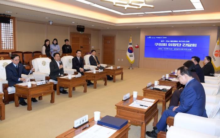 광주시와 5개 자치구의회가 (가칭)광주전남특별시의 성공적 안착을 위한 ‘대통합 공동 선언’을 발표했다.광주광역시(시장 강기정)는 12일 시청 비즈니스룸에서 ‘광주·전남 행정통합’ 관련 자치구의회 의장단 간담회를 열어 ‘(가칭)광주전남특별시’의 성공적인 안착을 위해 상호