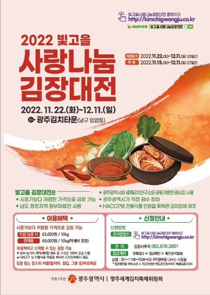광주광역시는 22일부터 12월11일까지 광주김치타운 다목적체험관에서 ‘2022 빛고을 사랑나눔 김장대전’을 개최한다.
