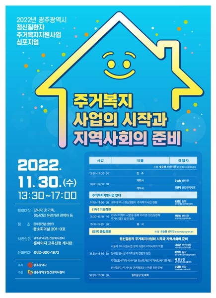 이번 심포지엄은 정신질환자 주거복지지원사업 필요성과 국내 정신질환자 주거지원사업의 현황을 공유하고, 광주시의 ‘정신질환자 자립생활주택운영’ 등 주거복지지원사업 정착을 위한 발전방향을 논의하기 위해 마련됐다.