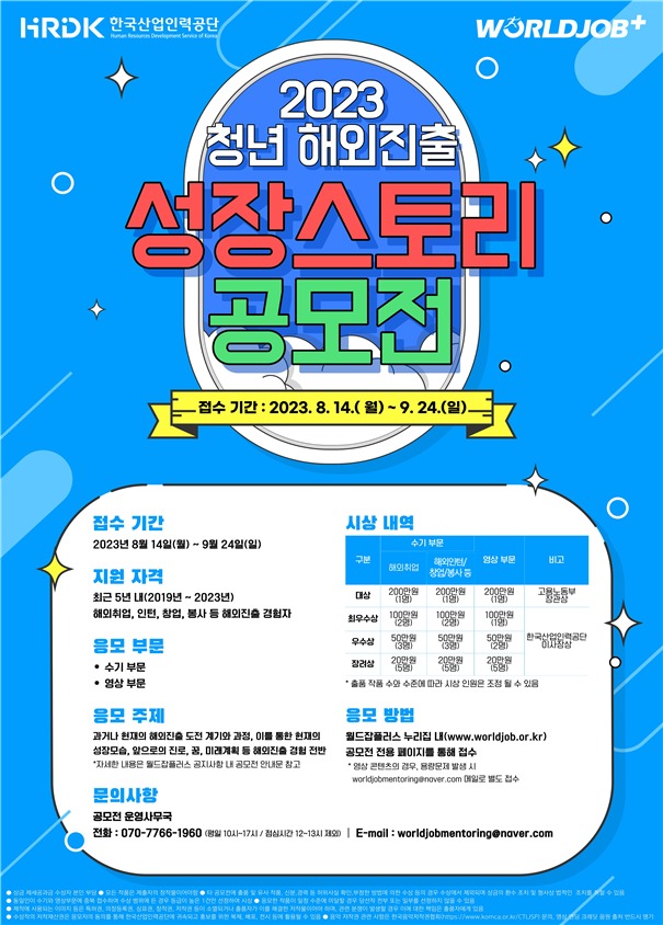 한국산업인력공단(이하 ‘공단’)은 ‘2023년 청년해외진출 성장스토리 공모전’을 9월 24일까지 개최한다.