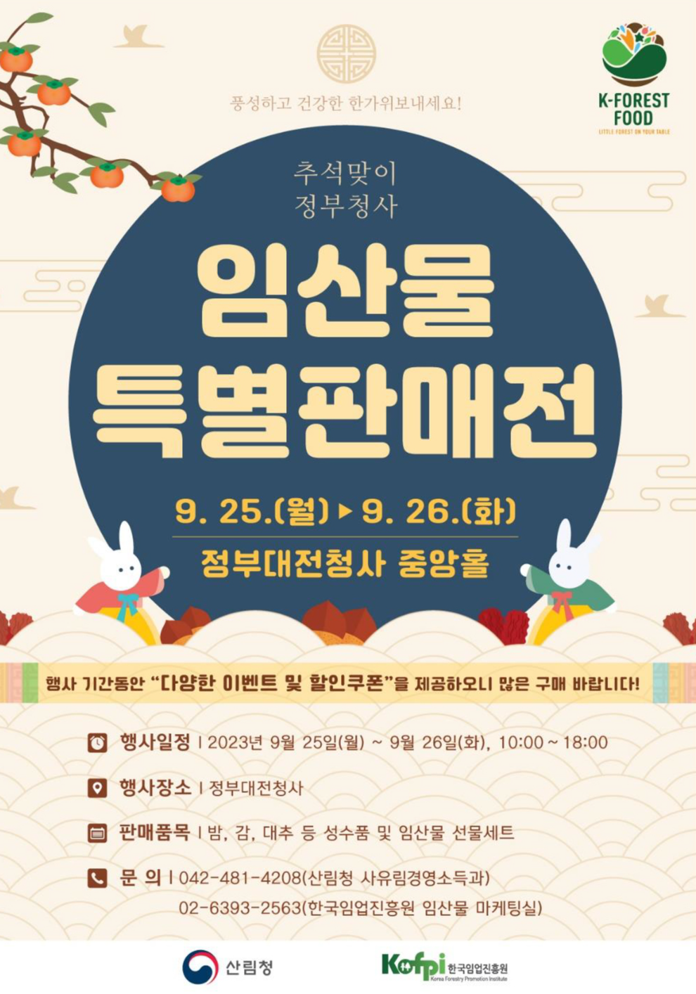 이번 할인전은 민족의 명절 추석을 맞아 우수한 우리 임산물의 홍보와 소비 촉진을 위해 마련되었으며, 임산물 구매에 재미를 더할 룰렛 행사와 아울러 현장에서 사용할 수 있는 3,000원 할인 쿠폰도 지급할 예정이다.