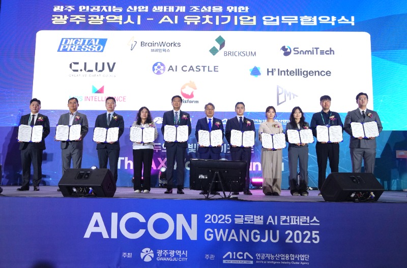 광주광역시(시장 강기정)는 15일 김대중컨벤션센터에서 열린 ‘아이콘(AICON) 광주 2025’ 개막식에서 국내 인공지능(AI) 유망기업 10개 사와 ‘광주형 인공지능(AI) 비즈니스 업무협약(MOU)’을 체결했다.