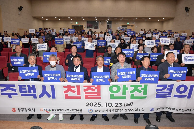 광주광역시(시장 강기정)는 23일 광주교통문화연수원에서 ‘택시운수종사자 친절·안전 결의대회’를 열고 신뢰받는 택시 서비스 구현을 위한 실천 의지를 다졌다.