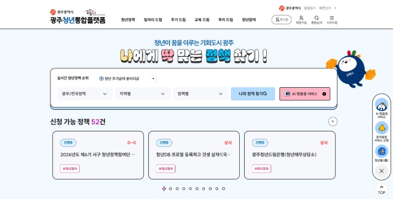 광주청년통합플랫폼은 일자리·주거·교육·복지문화 등 다양한 청년정책 정보를 인공지능(AI) 맞춤형 서비스로 제공하고, 정책 검색부터 신청까지 원스톱으로 가능하도록 개편한 것이 특징이다.