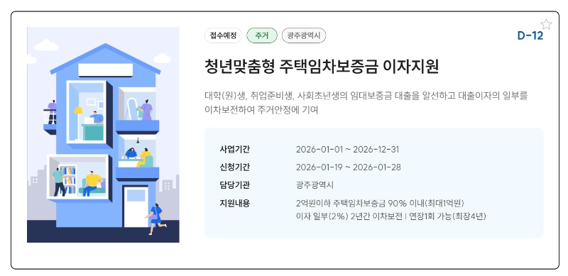 광주광역시(시장 강기정)는 무주택 청년의 주거비 부담 완화를 위한 청년맞춤형 주택임차보증금 이자지원 사업 대상자를 19일부터 모집한다.
