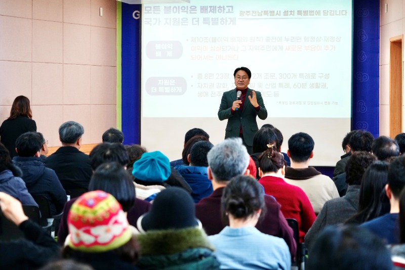 이상배 기후환경국장은 “통합하면 우리가 꿈꿨던 지속가능한 환경친화 생태도시를 실현할 수 있다”며 특별법에 담긴 환경 관련 20여개 특례 등을 설명했다. 특별법에는 ▲기후위기 선제적 대응과 탄소중립 전환 가속 ▲영산강·무등산·상수원 공동관리로 환경과 생태가치 향상 ▲풍요로운 생태자원이 교육·문화·경제·관광으로 연결 ▲태양광·풍력 등 지역에너지 순환구조가 산업과 일자리로 연결 등을 위한 내용이 담겼다.