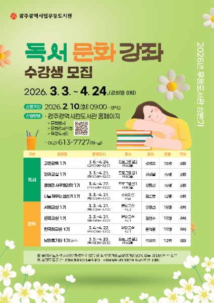 광주광역시 시립도서관(무등‧사직‧산수‧하남)은 3월부터 5월까지 운영하는 상반기 독서·문화교실 수강생을 오는 10일부터 선착순 모집한다.
