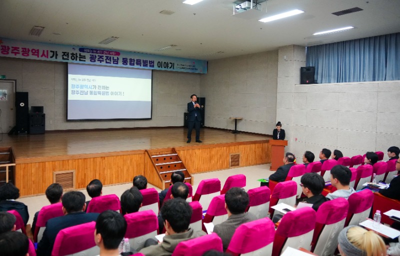 광주광역시(시장 강기정)는 19일 송원대학교 학생회관에서 ‘광주광역시가 전하는 광주전남 통합특별법 이야기’ 행사를 열어 통합특별법의 주요 내용과 통합 이후 변화상에 대해 청년들과 대화했다.