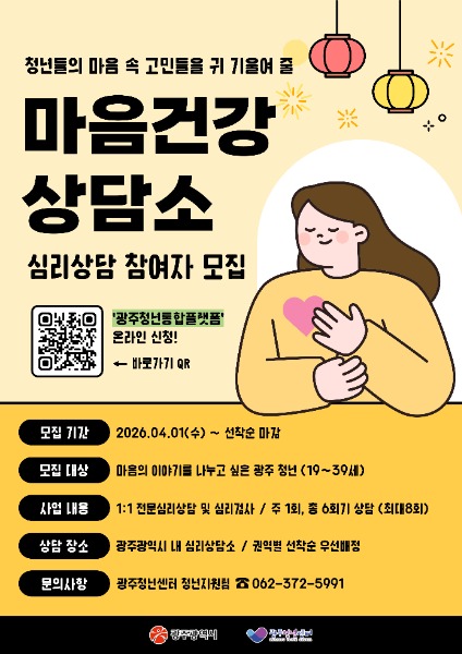 광주광역시는 지역 청년들이 취업 준비의 부담을 덜고 건강한 마음으로 미래를 설계할 수 있도록 오는 4월1일부터 ‘구직청년 자격증 취득지원 사업’과 ‘마음건강상담소’ 운영을 시작한다.