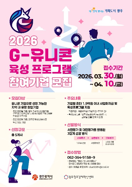 광주광역시는 지역 내 혁신기술을 보유한 창업기업을 발굴해 세계적 경쟁력을 갖춘 유니콘 기업으로 키우기 위한 ‘지(G)-유니콘 육성 프로그램’ 참가 기업을 오는 4월10일까지 모집한다.