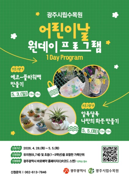 광주광역시 시립수목원은 어린이 가족이 함께 하는 ‘수목원 어린이날 원데이 프로그램’ 참가자를 오는 28일부터 선착순 모집한다.