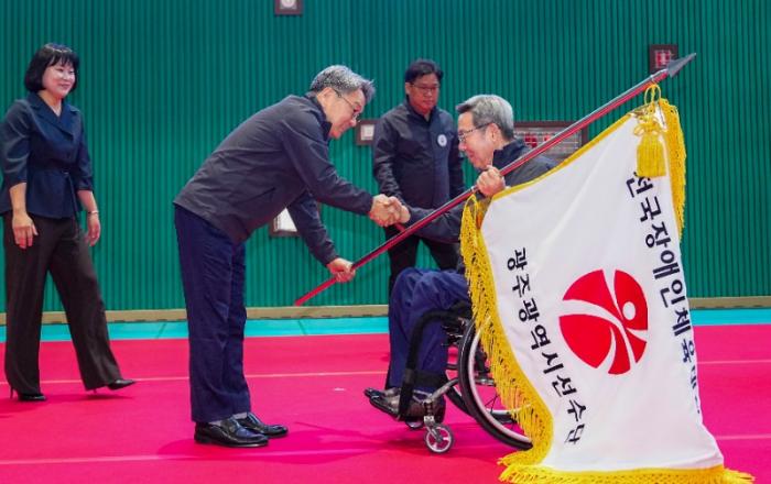 광주 장애인체육 선수단이 ‘제45회 전국장애인체육대회’를 앞두고 필승의 각오를 다졌다.광주광역시체육회(회장 강기정 광주광역시장)는 17일 광주시장애인국민체육센터에서 강기정 회장과 ...