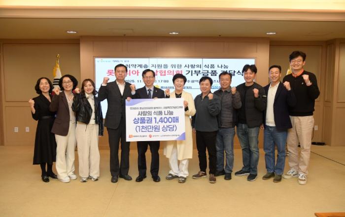 광주광역시(시장 강기정)는 27일 시청 비즈니스실에서 롯데리아 호남협의회, 광주사회복지협의회와 함께 ‘기부물품 전달식’을 가졌다.롯데리아 호남협의회는 이날 1만원 상당 상품권 1400매를 기부했으며, 사회복지협의회는 이를 지역 요양원 어르신과 지역아동센터 아동 등에게