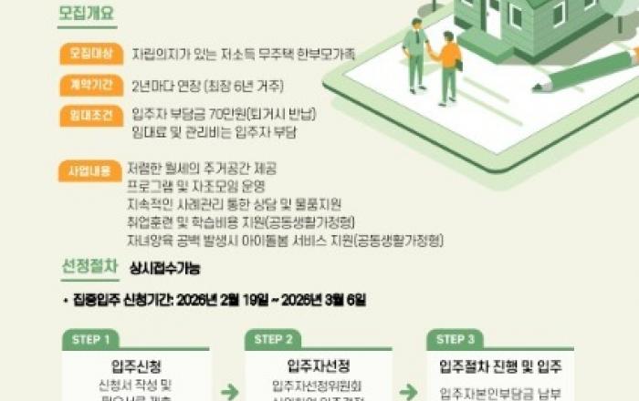 광주광역시(시장 강기정)는 자립 의지가 있는 저소득 무주택 한부모가족의 주거 안정을 돕기 위해 ‘한부모 주거 지원사업’ 입주자 46가구를 모집한다.‘한부모가족 주거 지원사업’은 한부모가족의 주거비 부담을 완화하고 안정적인 생활 기반을 마련하기 위해 임대주택 보증금을 지
