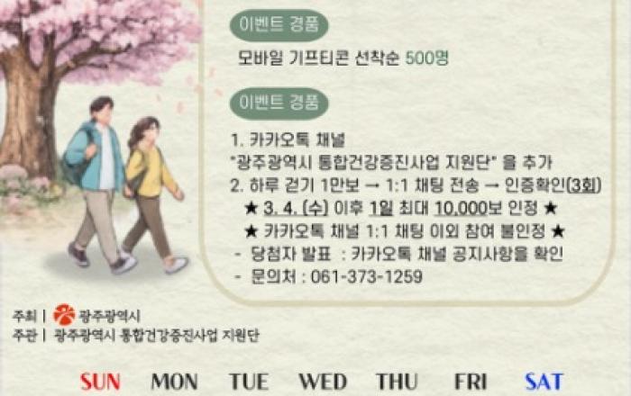 광주광역시(시장 강기정)는 ‘비만예방의 날’(3월4일)을 맞아 3월 4일부터 11일까지 시민 참여형 ‘하루 만보 걷기 챌린지’를 운영한다. 이번 행사는 ‘가볍게 일상에서 걷고, 물을 마시고, 나트륨·지방을 줄이자’를 구호로, 바쁜 일상에서 걷기 실천을 통해 건강한 생활
