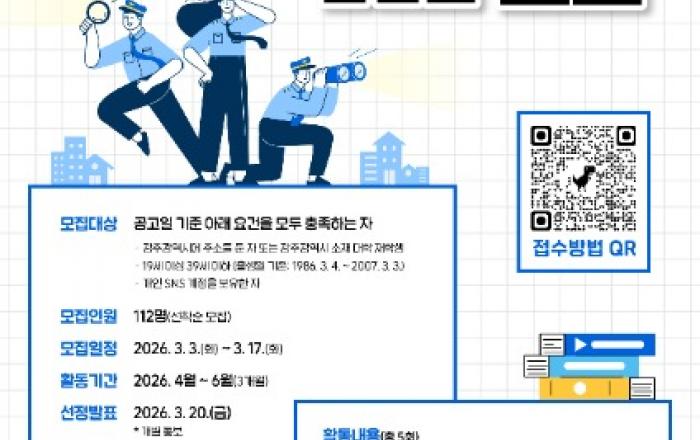 광주광역시 자치경찰위원회는 3일부터 17일까지 ‘제10기 청년 서포터즈 112’ 참여자 112명을 모집한다.‘청년 서포터즈 112’는 광주자치경찰위원회가 2021년 전국 최초로 도입한 청년 참여 프로그램으로, 청년들이 사회관계망서비스(SNS)를 활용해 자치경찰의 주요