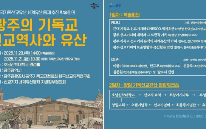 광주시가 남구 양림동을 중심으로 형성된 기독교 선교유산의 유네스코 세계유산 등재를 위한 학술회의를 개최한다.광주광역시(시장 강기정)는 20~21일 호남신학대학교 일원에서 ‘한국기독선교유산 세계유산 등재 추진을 위한 학술회의와 워크숍’을 열어 한국 근대 기독교 선교의 역