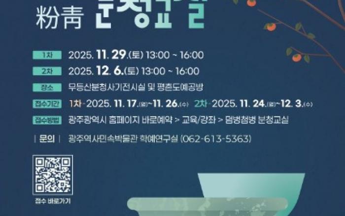 광주광역시 역사민속박물관은 ‘2025 덤벙첨벙 분청교실’을 11월29일과 12월6일 두 차례 운영한다.올해로 10회째를 맞는 ‘덤벙첨벙 분청교실’은 국가사적 ‘충효동 요지’의 우수성을 알리고 무등산분청사기전시실의 활용도를 높이기 위해 마련됐다.※ 충효동 요지 : 우리나