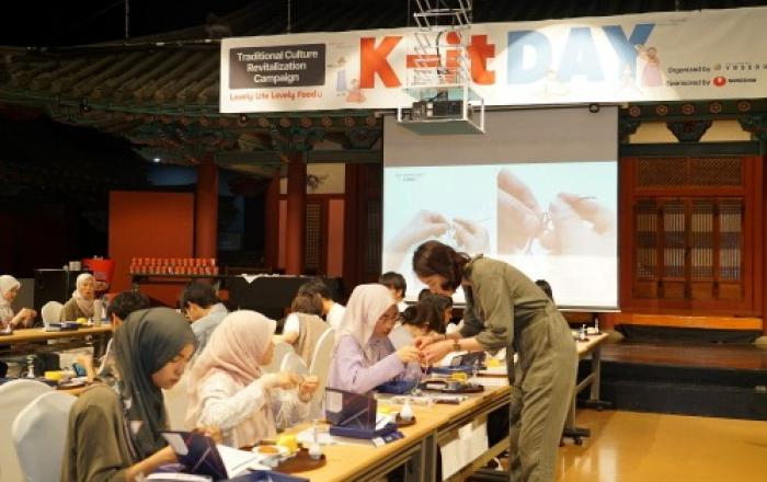 농심이 최근 서울 잠실 국가유산체험센터에서 말레이시아 국비유학생 50여 명을 대상으로 한국 무형유산을 직접 체험하는 ‘케잇데이’를 진행했다. 이날 국가무형유산 ‘매듭장’ 박형민 이수자가 한국 전통 공예 기술인 매듭장을 시연하고, 유학생들이 직접 매듭 팔찌와 키링을 만들
