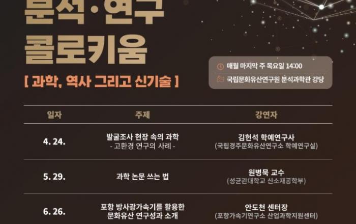 국가유산청 국립문화유산연구원은 4월부터 10월까지 매월 마지막 주 목요일 오후 2시에 국립문화유산연구원 분석과학관 강당(대전 유성구)에서 『2025 문화유산 분석·연구 콜로키움–과학, 역사 그리고 신기술』을 개최한다.2023년에 시작되어 올해로 세 번째 개최되는 『문화