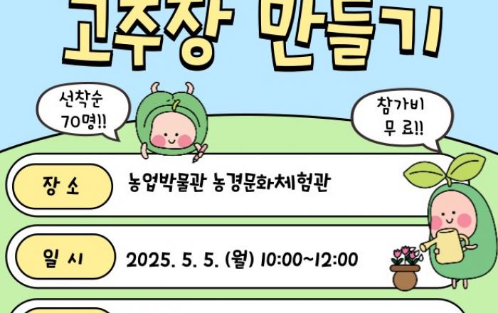 전라남도농업박물관(관장 김옥경)이 5월 5일 어린이날을 맞아 오전 10시부터 12시까지 농경문화체험관에서 도민이 직접 참여하는 ‘콩 화분 & 고추장 만들기 체험행사’를 개최한다.체험행사는 어린이와 가족 단위 참가자를 대상으로, 농업과 전통 음식문화를 쉽고 즐겁게 배울