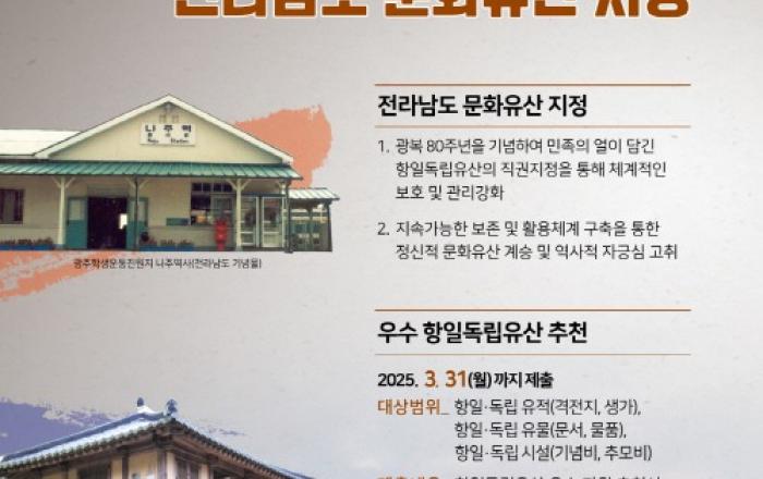 전라남도가 광복 80주년을 맞아 항일독립유산을 체계적으로 보호하고 관리를 강화하기 위해 전국 광역자치단체 중 최초로 도 지정문화유산 지정을 추진한다.이는 항일독립유산의 체계적 보호 및 활용을 위한 것이다. 해당 유산을 발굴하고 기록화하며, 지역 주민과의 협력을 강화하는