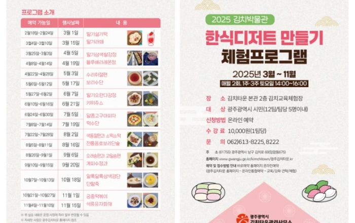 광주광역시(시장 강기정)는 올해 광주김치타운에서 시민들을 대상으로 전통발효음식을 주제로 한 다양한 교육·체험 프로그램을 운영한다. 광주김치타운에서 운영하는 프로그램은 광주시 무형유산과 김치명인 등 전문 강사진으로 구성돼 큰 인기를 얻고 있다.광주김치타운 대표 체험인 김