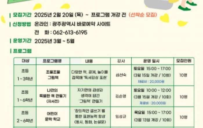 광주광역시 광주문학관은 올해 상반기 정기프로그램을 3월부터 5월까지 운영한다. 상반기 프로그램은 한강 작가의 노벨문학상 수상 이후 ‘제2의 한강’을 꿈꾸는 시민들의 글쓰기 능력을 키울 수 있도록 성인과 어린이를 대상으로 총 6개의 강좌로 구성됐다.성인강좌는 ▲나를 찾아