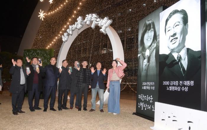 “한강의 꿈, 광주의 빛을 밝힌다.”광주광역시(시장 강기정)는 10일 오후 7시45분 시청 행정동 앞 잔디광장에서 강기정 광주시장과 시민, 직원 100여명이 참석한 가운데 한강 작가 노벨상 수상 축하조형물 점등식을 개최한다.광주시는 광주시청을 방문하는 시민들이 한강 작